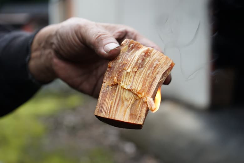 松の表面に敢えて傷をつけ樹液である松脂(松ヤニ)が出てきた松材や、朽ちて枯木になり松脂が溜まってきた松材を燃やすなどして、煤を集めていきます。
